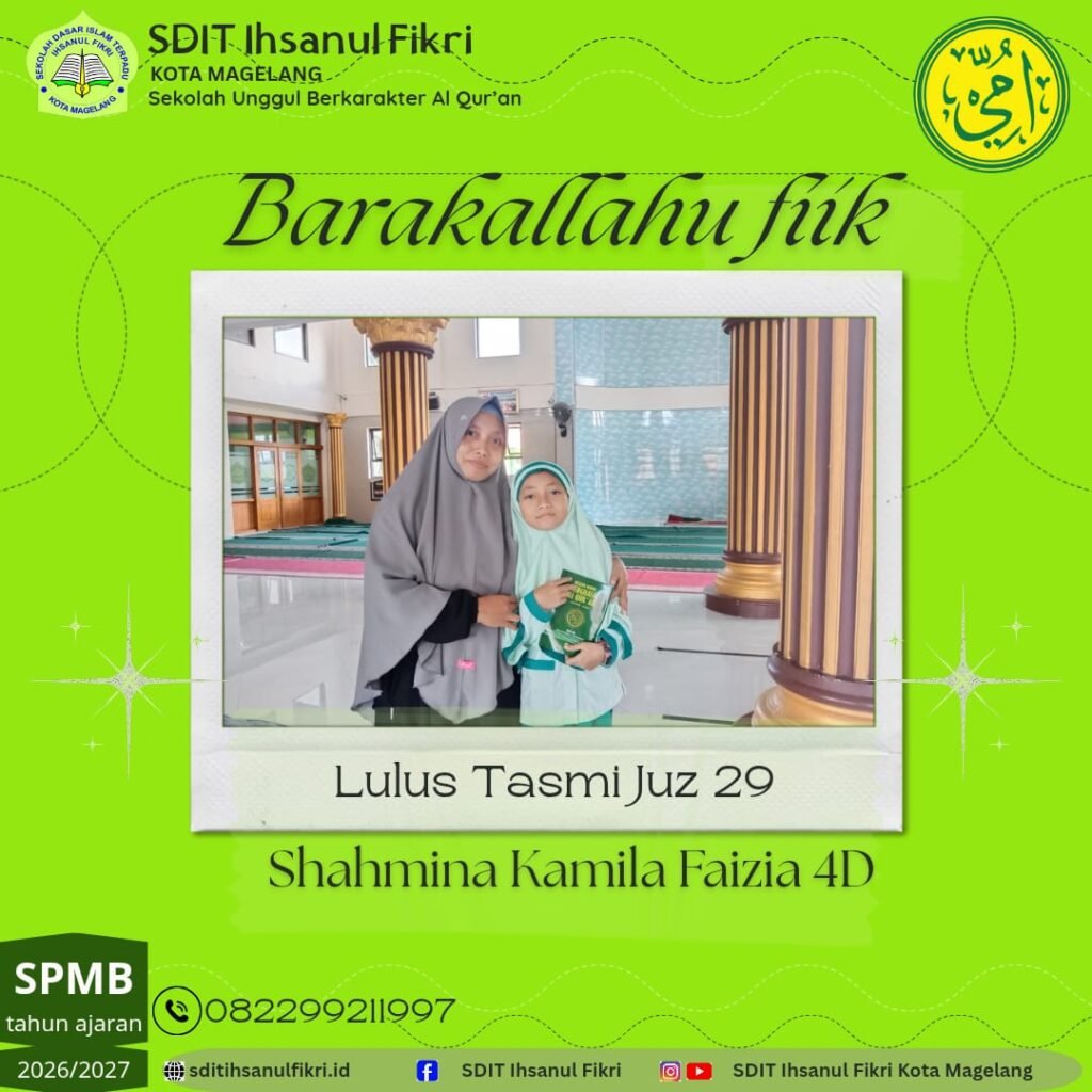 Seluruh civitas akademika SDIT Ihsanul Fikri menyampaikan ucapan “Barakallahu fiik” (Semoga Allah memberkahi Anda) kepada Nayla atas prestasi yang mengharumkan nama sekolah. Semoga capaian ini menjadi motivasi bagi Nayla dan seluruh siswa lainnya untuk terus berprestasi, baik di bidang agama maupun umum.