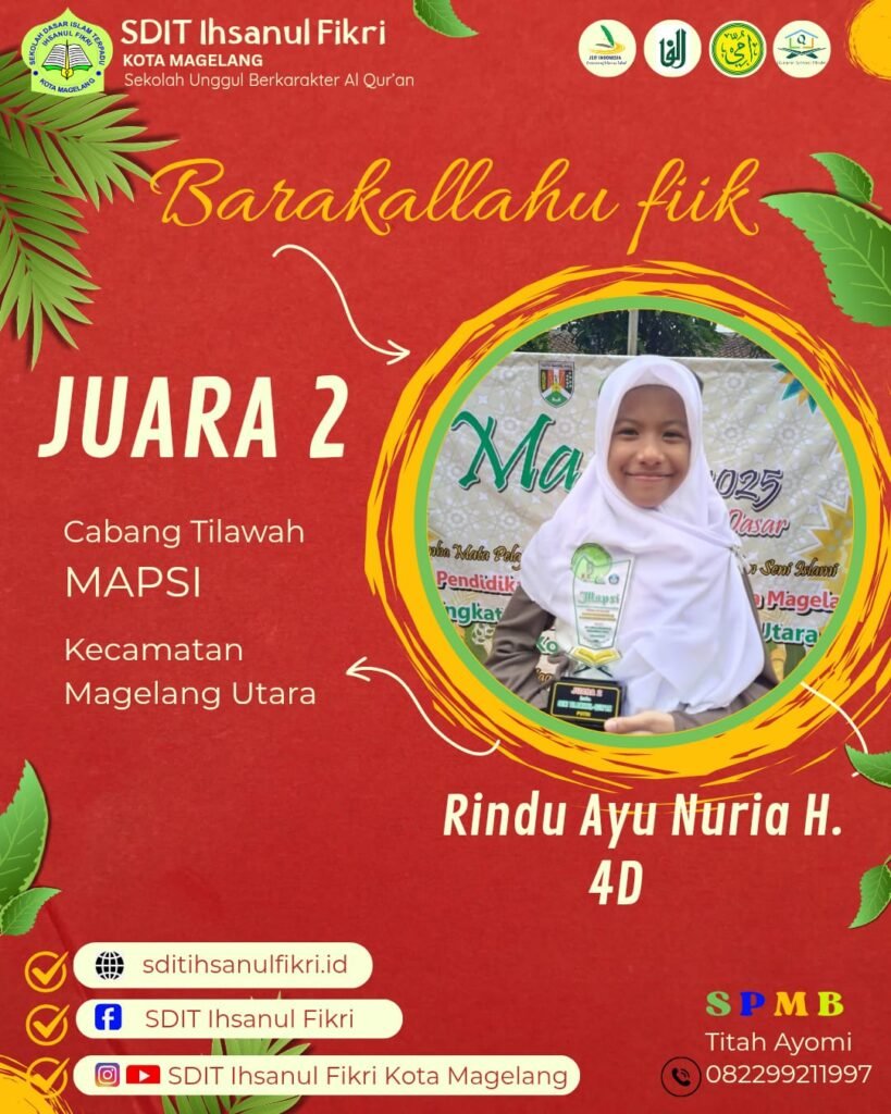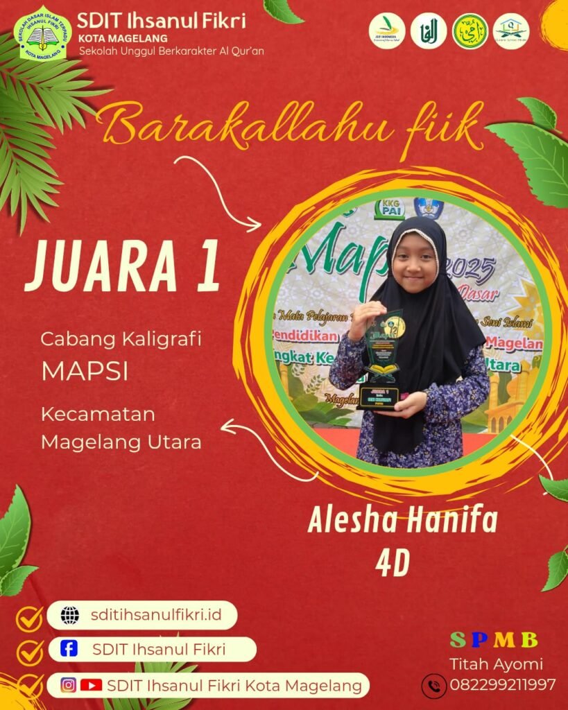 Prestasi ini diraih dalam kompetisi yang diselenggarakan di Kecamatan Magelang Utara. Pencapaian Nayla menjadi bukti nyata bahwa semangat dan komitmen SDIT Ihsanul Fikri sebagai “Sekolah Unggul Berkarakter Al Qur’an” tidak hanya tercermin dalam akademik, tetapi juga dalam pengembangan bakat dan kecintaan siswa terhadap seni Islami.